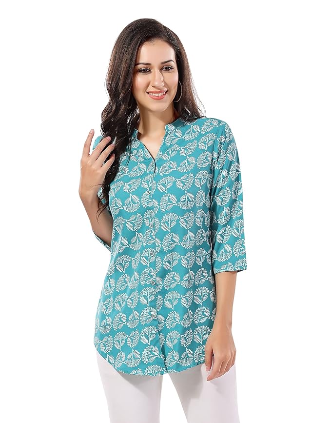 Fabric: Poly Crepe Printed Hip Long 3/4 Sleeves with Apple Cut Hem This product Chest (Bust) Size in inches: S=38 inches, M=40 Inches, L=42 inches XL=44 inches, XXL=46 and 3XL=48 inches chest size. Please make sure the size before placing order. Method of measuring the size with Inch Tape from Under Arms to Under Arms end to end