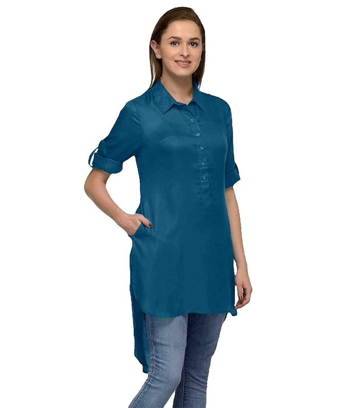 Fabric: 60% Viscose, 40% Silk Type: High Low Tunic Tops | Neck: Classic Collar | Pattern: Solid Sleeve Length: Long Sleeve ; Sleeve Styling: Rollup Sleeve Weave Type: Woven | Transpparency: Opaque | Length: Regular Size: 4XL; Bust: 48 Inches ; Please Refer Size Chart Given in LAST IMAGE